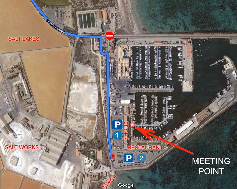 Your hotel will be able to arrange a local taxi company to bring you to the Marina de las Salinas. Ask your taxi driver to drop you near La Llana restaurant, (the back of this faces car park 2). From here it is a short walk to the marina.