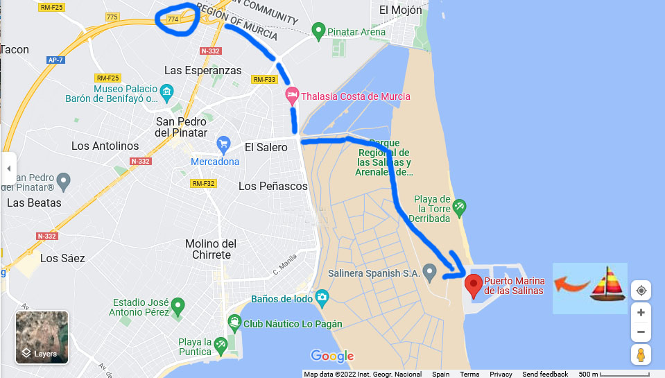 The AP7 motorway runs past the town of San Pedro del Pinatar. Leave the motorway at junction 774 Signposted San Pedro del Pinatar and Pilar de la Horadada